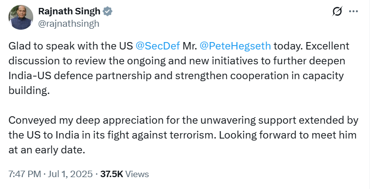 भारत और अमेरिका के बीच रणनीतिक रक्षा साझेदारी को और मजबूत करने की दिशा में सोमवार को एक अहम कदम देखने को मिला। भारत के रक्षा मंत्री राजनाथ सिंह और अमेरिका के रक्षा सचिव पिट हेगसेथ के बीच फोन पर महत्वपूर्ण बातचीत हुई। इस दौरान दोनों नेताओं ने द्विपक्षीय रक्षा सहयोग को गहरा करने, इंडो-पैसिफिक क्षेत्र में स्थिरता बनाए रखने और आधुनिक रक्षा प्रौद्योगिकियों में साझेदारी को लेकर विस्तार से चर्चा की।